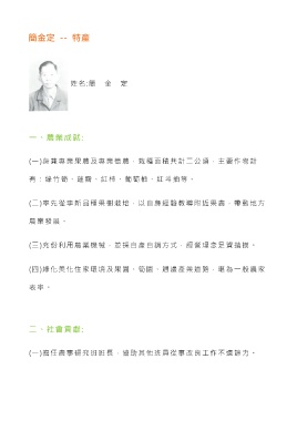 簡金定 -- 特產 姓 名 :簡 金 定 一、農業成就: (一)身兼專業果農及專業筍農,栽種面積共計二公頃,主要作物計 有:綠竹筍、蓮霧、紅柿、葡萄柚、紅斗抽等。 (二)率先從事新品種果樹栽培,以自身經驗教導附近果農,帶動地方 農業發展。 (三)充份利用農業機械,並採自產自銷方式,經營理念足資揩摸。 (四)綠化美化住家環境及果園、筍園、週邊產業道路,堪為一般農家 表 率 。 二、社會貢獻: (一)擔任農事研究班班長,協助其他班員從事改良工作不遺餘力。