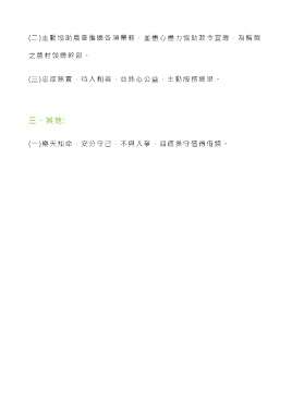 (二)主動協助農會推廣各項業務,並盡心盡力協助政令宣導,為稱職 之農村領導幹部。 (三)忠厚篤實,待人和善,並熱心公益,主動服務鄉里。 三、其他: (一)樂天知命,安分守己,不與人爭,品德操守值得借鏡。