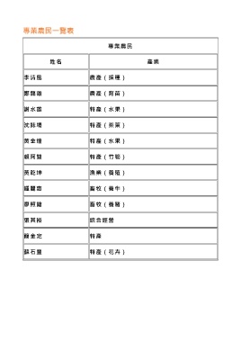 專業農民一覽表 專業農民 姓 名 產 業 李清風 農產(採種) 鄭龍雄 農產(育苗) 謝水雄 特產(水果) 沈鋕場 特產(茶葉) 黃金煌 特產(水果) 賴阿雙 特產(竹筍) 黃乾坤 漁業(養殖) 鍾麗惠 畜牧(養牛) 廖照鎗 畜牧(養豬) 張其裕 綜合經營 簡金定 特 產 蘇石豐 特產(花卉)