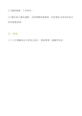 (二)服務鄰里,工作熱忱。 (三)擔任核心農民講師,及四健義務指導員,附近農民及青年均能分 享其經營成果。 三、其他: 七十八年獲選派赴日研習三個月,研習蔬菜、園藝等項目。