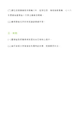 (二)擔任四健會義務指導員八年,任勞任怨,積極服務會員,七十八 年度選為臺灣省十大傑出義務指導員。 (三)義務擔任花卉研習班講師貢獻所學。 三、其他: (一)臺灣省政府糧食局家庭收支記帳核心農戶。 (二)曾任草根大使並接待各國來訪外賓,促進國民外交。