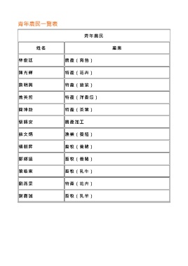 青年農民一覽表 青年農民 姓 名 產 業 林俊廷 農產(育苗) 陳光輝 特產(花卉) 詹明興 特產(蔬菜) 曾英哲 特產(洋香瓜) 簡坤助 特產(茶葉) 蔡錫安 農產加工 蘇文炳 漁業(養殖) 楊朝昇 畜牧(養豬) 鄒鄉遠 畜牧(養豬) 葉皓東 畜牧(乳牛) 劉燕景 特產(花卉) 謝嘉誠 畜牧(乳羊)