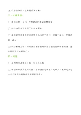(三)從事農作外,並育種鵝當副業。 三、社會貢獻: (一)提供土地一○ ○ 坪興建共同運銷班集貨場。 (二)熱心協助家政推廣工作成績優良。 (三)樂喜好施曾捐建社區活動中心水泥二百包、寺廟三萬元、社會救 濟一萬元。 (四)熱心教育工作,時常捐獻圖書畫刊供國小及托兒所學童閱讀,並 於閒暇至托充所幫忙。 四、其他: (一)參加家事改進班十年,任班長五年。 (二)參加家政推廣教育活動,曾分別於七十五、七十六、七十七及七 十八年獲獎並獲縣府表揚優秀班長。
