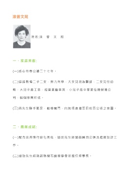 涂曾文苑 姓 名 :涂 曾 文 苑 一、家庭貢獻: (一)悉心侍奉公婆二十七年。 (二)諄諄教悔二子二女,努力向學,大女兒現為醫師,二女兒任幼 教,大兒子農工畢,經營園藝事業,小兒子高中畢業任職保險公 司,個個事業所成。 (三)與先生胼手胝足,勤檢奮鬥,向無恆產增至目前四公頃之苗園。 二、農業成就: (一)配合政府推行綠化美化,協助先生經營苗圃四公頃及庭園設計工 作 。 (二)協助先生組識該縣樹石藝術學會並擔任理事長。