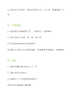 (三)由原五分地稻田,擴增至現有水田 ○ · 七公頃,釀酒葡萄二公 頃 。 三、社會貢獻: (一)協助家政推廣教育工作,不餘遺力,成績優良。 (二)熱心協助村民婚、喪、喜、慶工作。 (三)經常勸募慈善基金救助貧困。 (四)提供土地配合公所鋪設農路,促進農業生產運銷,造福鄰里。 四、其他: (一)擔任家事改進班班長二十一年。 (二)婦女會村里召集人。 (三)當選七十九年度該縣模範婦女。 (四)參加各項競賽均獲獎勵。