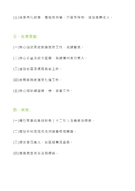 (三)採多角化經營,種植筊白筍、芥菜等作物,增加農業收入。 三、社會貢獻: (一)熱心協助家政推廣教育工作,成績優異。 (二)熱心公益及政令宣導,為績優村里召集人。 (三)協助社區及媽媽教室工作。 (四)長期義務維護焚化爐工作。 (五)熱心協助鄰里婚、喪、喜慶工作。 四、其他: (一)擔任家事改進班班長(十二年)及義務指導員。 (二)擔任柑桔班班長及四健義務指導員。 (三)婦女會召集人、社區理事及委員。 (四)媽媽教室班長及輔導員。