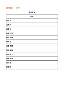 農家婦女一覽表 農家婦女 姓 名 劉玉治 高美女 江蘭英 莊蔡松茸 侯古秋榮 曾文苑 范詹鳳蘭 黎吳富梅 林蔡錦玉 曾楊美英 張陳鑾 莊明玉