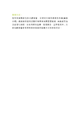 管 理 方 式 : 在生育適期參加多次講習會,並接受台南區農業改良場(嘉 義 分 場 )、農業藥物毒物試驗所等專家有關田間栽培、病蟲害防治 及合理化施肥、安全用藥等生產、管理觀念,並降低成本;另 參加觀摩會參考其他專業區農民栽種方式等技術交流。